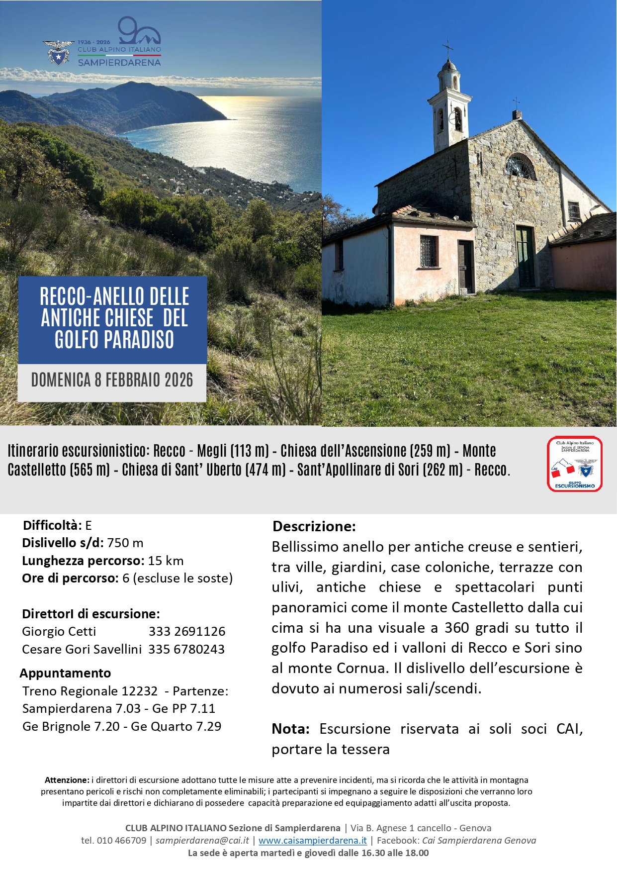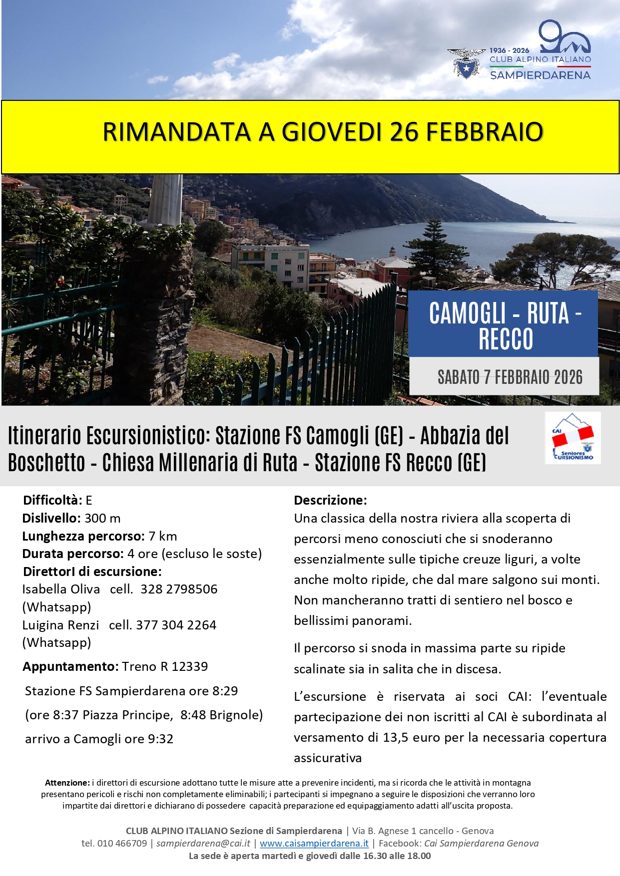L’escursione del Gruppo Escursionismo Seniores “Camogli-Ruta-Recco”, programmata per Sabato 7 Febbraio, è spostata a Giovedì 26 Febbraio